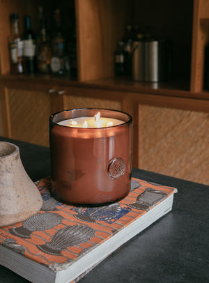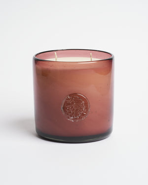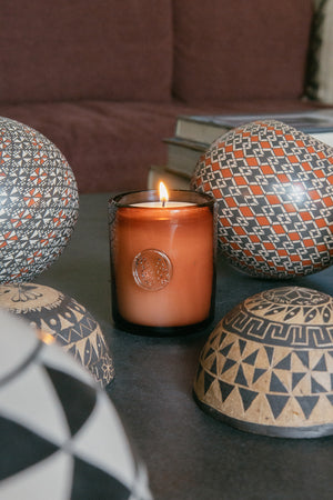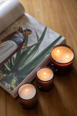 Esta vela está hecha a base de cera de soya y aceites naturales. El recipiente de Vidrio Soplado fue elaborado por artesanos de Tonalá, Jalisco.