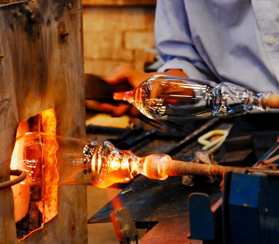 Para su elaboración, los artesanos trituran vidrio y lo derriten durante horas en hornos que alcanzan una temperatura de 1600 ºC, hasta obtener una masa espesa y moldeable.