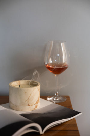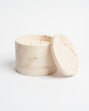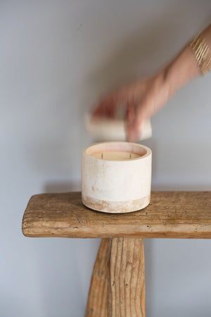 Esta vela está hecha a base de cera de soya y aceites esenciales naturales. El recipiente fue elaborado a mano por talentosos artesanos de Yucatán. La materia prima es crema maya, una piedra natural extraída de canteras locales, única por su tonalidad blanca.