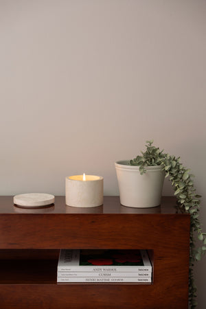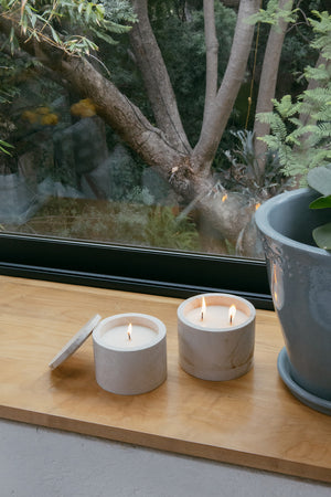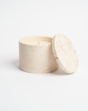 Esta vela está hecha a base de cera de soya y aceites esenciales naturales. El recipiente fue elaborado a mano por talentosos artesanos de Yucatán. La materia prima es crema maya, una piedra natural extraída de canteras locales, única por su tonalidad blanca.