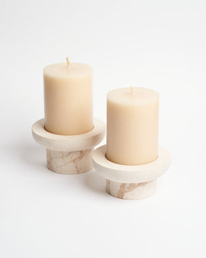 Este Juego de Porta Cirios fue elaborado a mano por talentosos artesanos de Yucatán. La materia prima es crema maya, una piedra natural extraída de canteras locales, única por su tonalidad blanca.