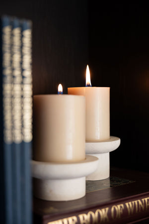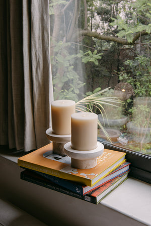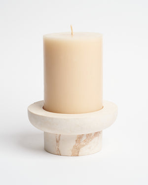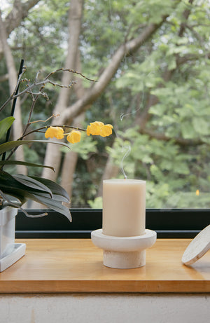 Este Porta Cirio fue elaborado a mano por talentosos artesanos de Yucatán. La materia prima es crema maya, una piedra natural extraída de canteras locales, única por su tonalidad blanca.